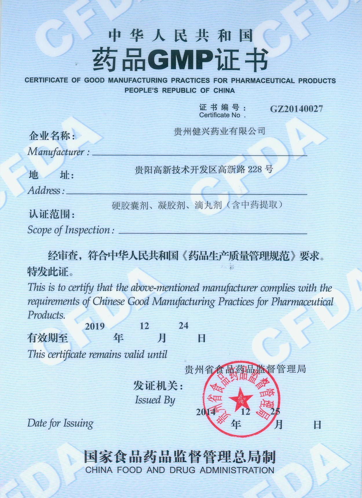 貴州省藥監(jiān)局于11月份開始,對公司原有廠房和車間、新增廠房和車間,進行全面檢查,結果認定為合格,因此于本月25日向公司換發(fā)新的GMP證書。